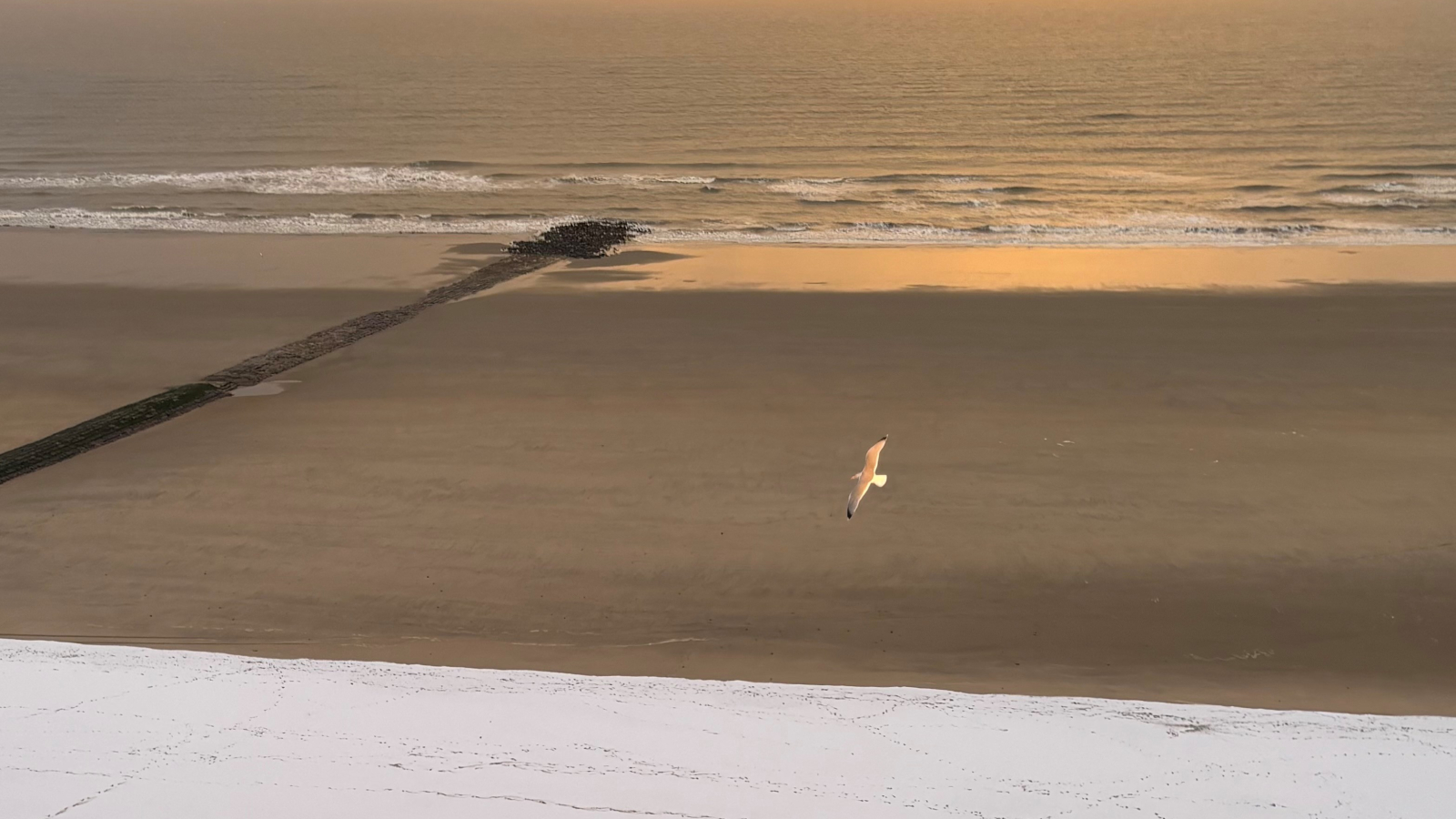 Geen overweldigend wit sneeuwtapijt waaruit je naar hartenlust sneeuwballen kon maken, maar net genoeg om het strand een smetteloos uitzicht te bezorgen.