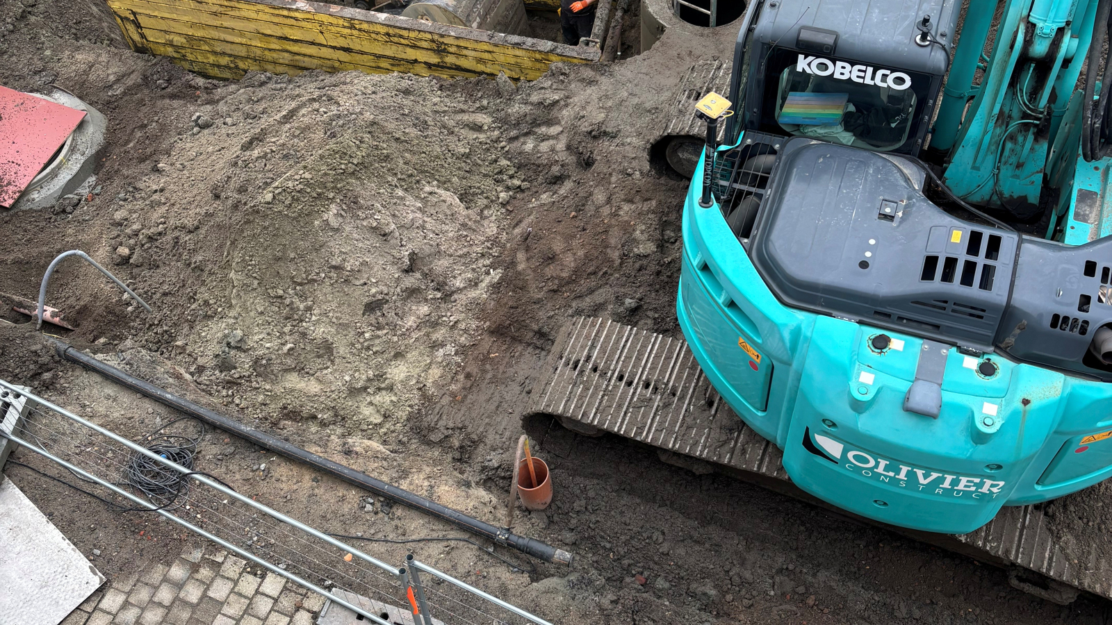De doorgang op die hoek is gereduceerd tot één rijvak, een stuk weggenomen voetpad inbegrepen. Daar staan we dan te blinken.
